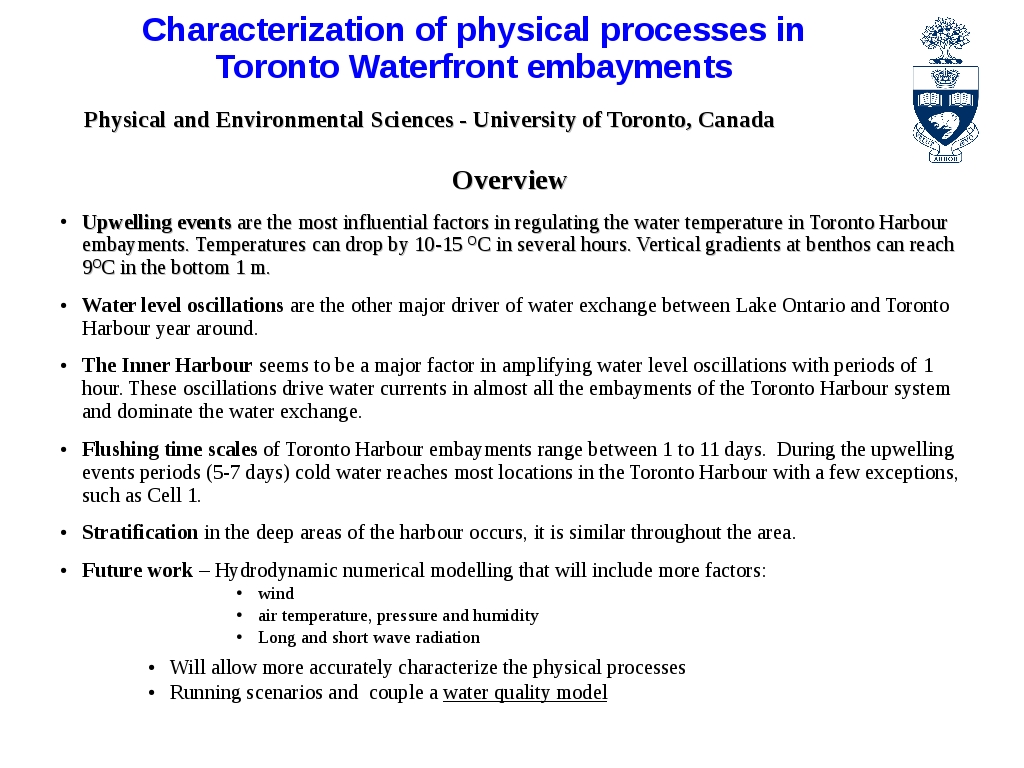 The Outer Harbour is connected directly to Lake Ontario through a wide opening and it is characterized by strong bathymetric slopes on the northern shore due to the presence of the navigation channel (10 m depth). The bottom is dominated by bedrock closer to the underwater Toronto escarpment, but develops into mud substrate toward the head of the embayment.