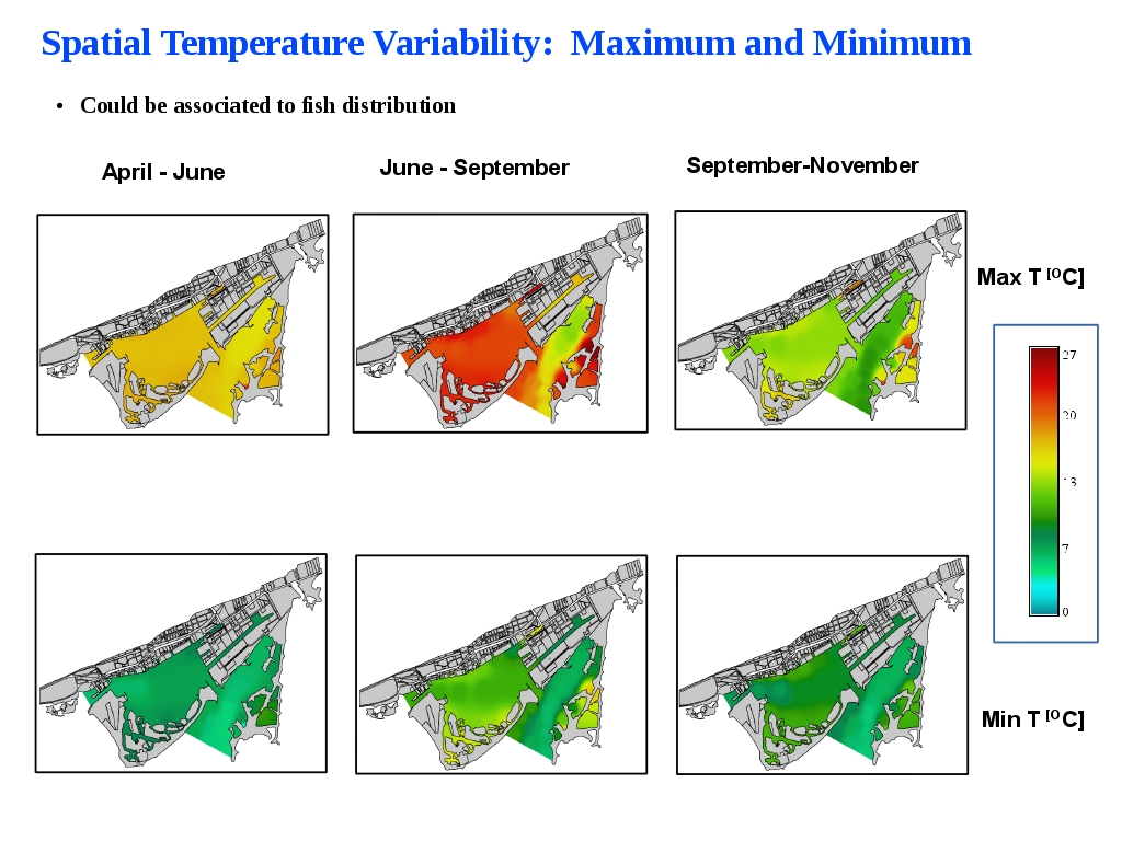 The grid of temperature loggers has been used to create benthic temperature variability maps that can be associated to fish distribution. The an inverse cost weighting algorithm was used.